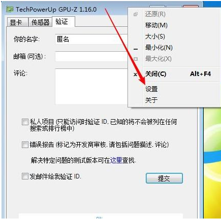 5、使用显卡检测软件可以很快速的进行显卡体质测试,在软件上方的标题栏右键单击选择设置。