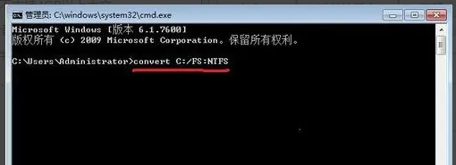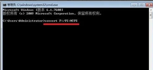 步骤4、调出命令提示符之后,在路径后面输入convert F:/FS:NTFS,将f盘转换成NTFS格式。