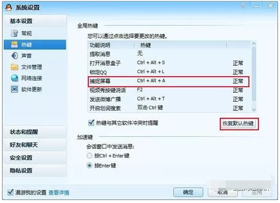 1、QQ是大家比较常用的聊天工具了,经常使用QQ的朋友肯定都知道QQ有一个截图的快捷工具,只需打开QQ后保持登陆的状态,就可以按键盘快捷键“CTR+ALT+A”来进行定制截图,你也可以进入qq系统设置内修改截图的快捷键,非常的方便。