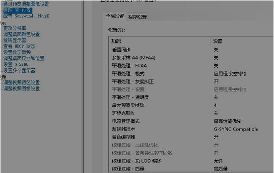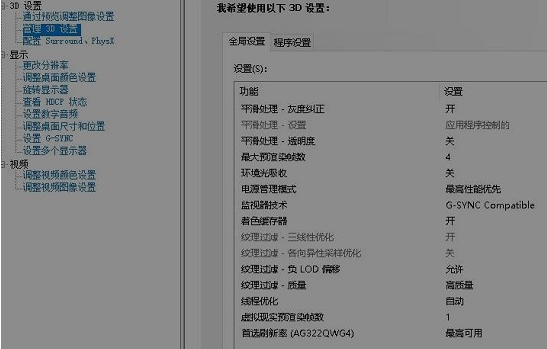 2、点击左边的“管理3d设置”,按照以下图中所示进行设置。