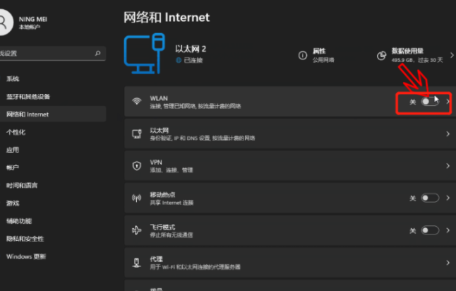 2、点击WLAN旁边的开关按钮变成“开” 。