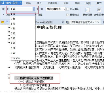 2、接着选中每一级标题,鼠标点击“正文文本”下拉菜单,选中对应的标题级别,1-9级,1级为最高。