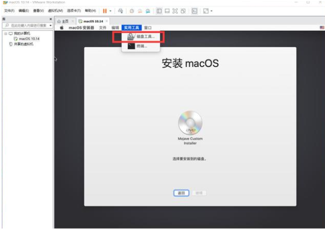 9.进入安装界面,发现无法正常安装,是因为没有磁盘。点击顶部实用工具,选择磁盘工具功能就可以啦。