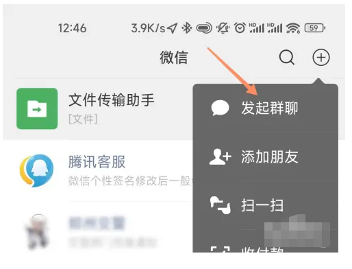 1.在页面中点击【加号】后点击【发起群聊】。