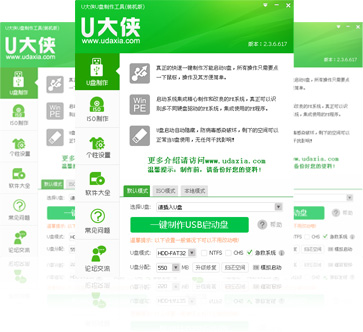 1.在运行U大侠主程序之前请尽量关闭杀毒软件和安全相关的软件。(本软件部分功能涉及对U盘的读写操作,部分杀毒软件的误报会导致程序报错!)下载好U大侠软件后解压然后进行安装,安装完毕后(Windows XP系统下直接双击主程序运行,Windows Vista或者7/8系统请先点击右键"以管理员身份运行") 点击查看【U大侠U盘启动盘的制作】详细教程2.插入U盘之后点击