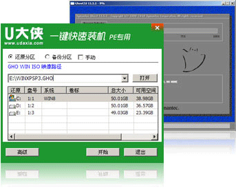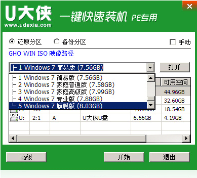 进入Win PE系统后打开U大侠一键装机工具安装,此工具运行后首先默认显示U盘里面储存的系统文件,如果没有找到您需要的系统文件(显示空白)那么请重复点击"打开"按钮将列出所有磁盘中可用的系统镜像文件,选择好以后点击"开始"按钮即可完成安装。(安装磁盘默认选择C盘)