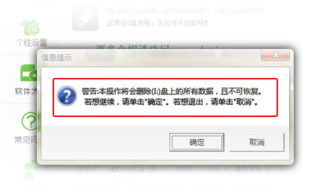按钮,程序会提示是否继续,确认所选U盘无重要数据后开始制作:制作过程中不要进行其他操作以免造成制作失败,制作过程中可能会出现短时间的停顿,请耐心等待几秒钟,当提示制作完成时即完成启动U盘的制作。
