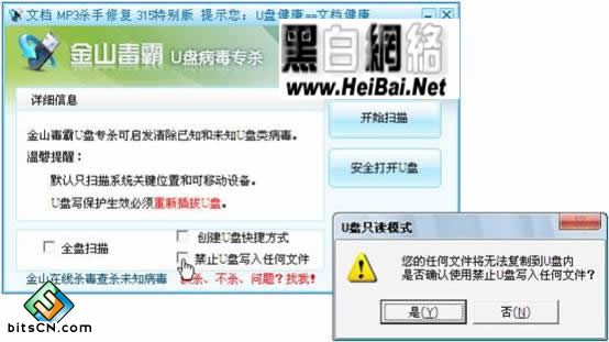 金山U盘病毒专杀提供的“禁止U盘写入任何文件”服务,可以帮助用户实现无法复制文件到U盘的功效,如图所示。