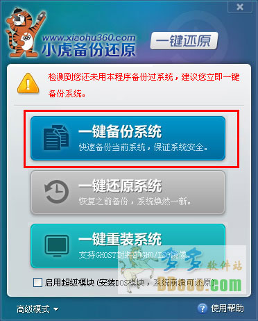 3、备份完毕后重新启动电脑,打开小虎一键备份还原系统即可看到程序自动检测到刚刚备份了系统。以后当系统中毒或是出现其它问题时点击“一键还原系统”即可将系统恢复到之前备份的状态。