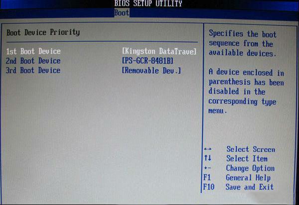 启动优先级设备选择(Boot Device Priority)在第一启动设备(1st Boot Device)里选择U盘。