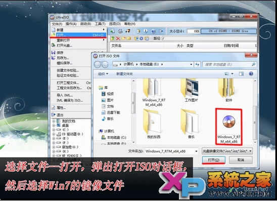 1、准备好上面工具后,打开软碟通UltraISO,选择“文件”→“打开”,弹出打开ISO对话框,然后选择Windows 7的ISO镜像文件。