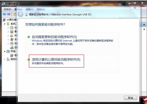 2、点击“浏览计算机以查找驱动程序软件”,如下图所示: