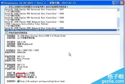 四、下载之后运行软件,软件会显示插入u盘信息,然后点击开始按钮开始低格。这里小编使用的是AlcorM_UFD。