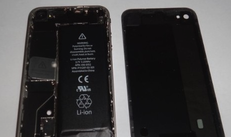 1.松开iphone4下方两个螺丝,后盖向上一推,轻松打开iphone4的后盖,露出电池等等,如下图。