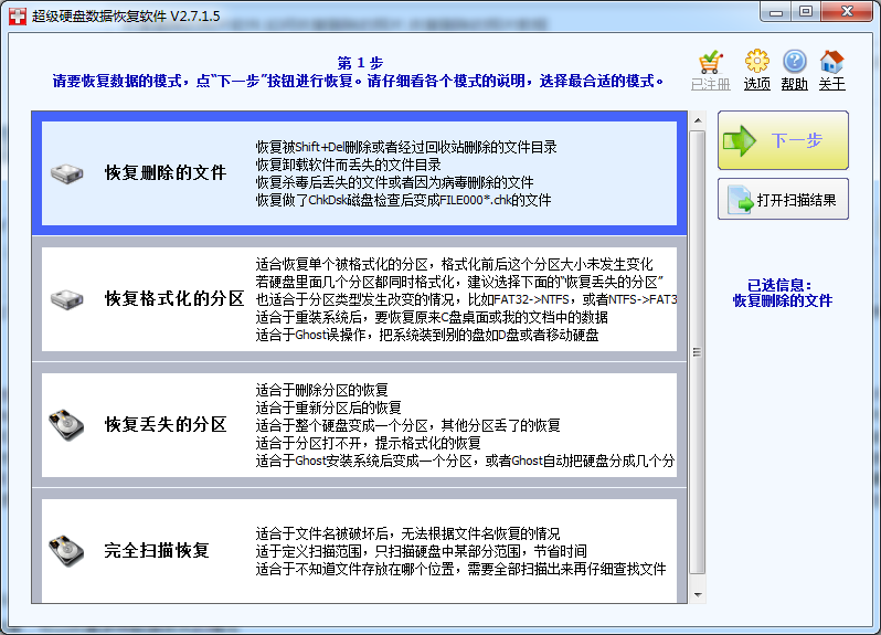 1、在软件中选择恢复删除的文件并点击下一步。