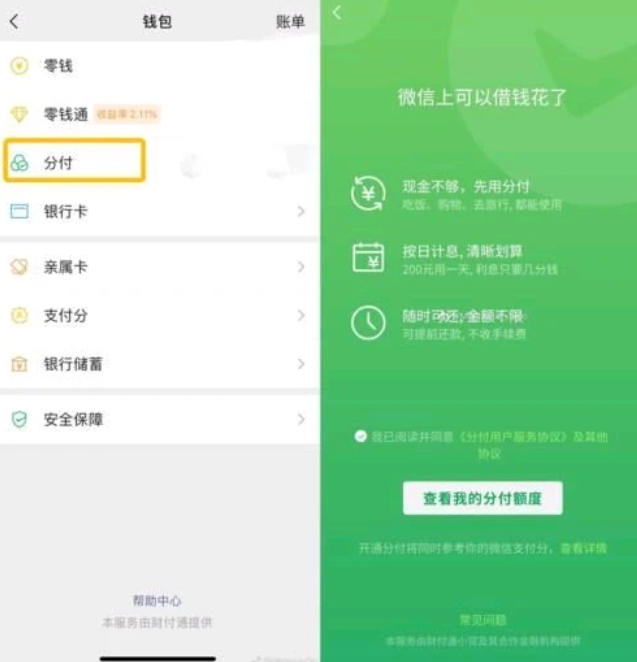 1、微信悄悄启动了一项新功能,称为“分付”,也就是我们今天要介绍的微信花呗,如何使用呢?首先打开时,您可以立即检查分配金额,这意味着您可以借多少钱。分配量是根据历史记录和合规记录等各个方面计算的。