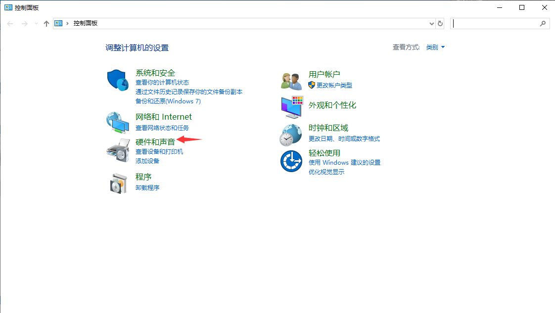 1、在开始菜单里找到并打开控制面板,点击硬件和声音进入。