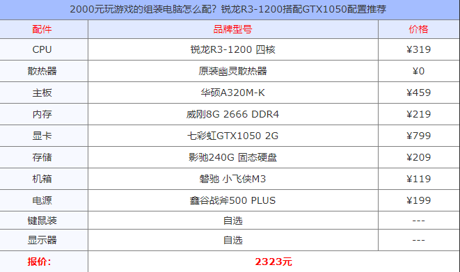 1、2000元的配置。您可以玩一些简单的小型游戏,然后大体上运行。例如:玩LOL,魔兽世界和其他主流游戏。