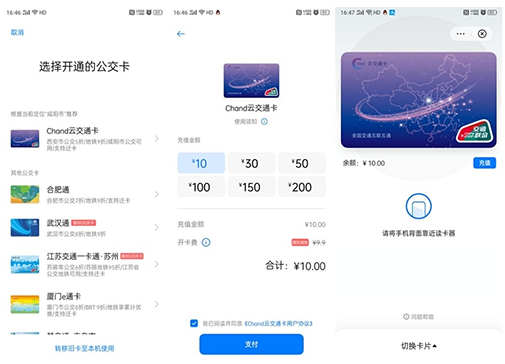 转到“钱包”-“乘坐”-“添加公交卡”-“选择城市公交卡”-“选择金额”-“付款”-“发卡”。