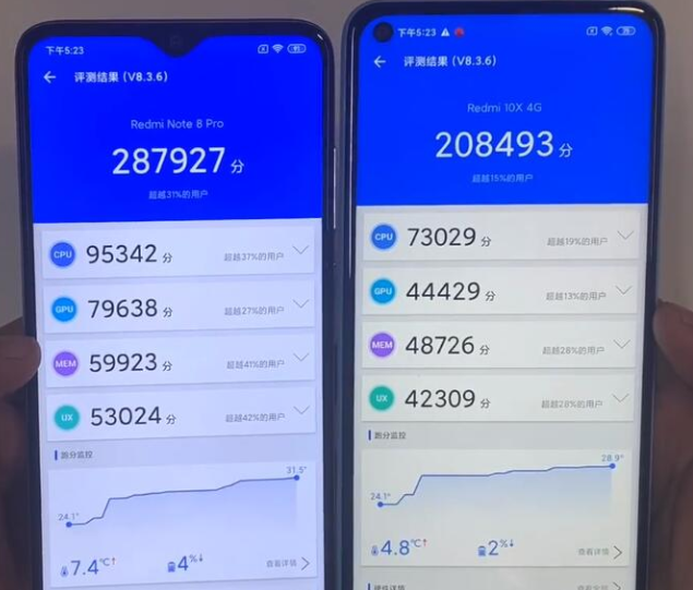 1、首先小编提供一下红米10X 4G版的跑分和去年红米Note 8 pro的联发科G90T的跑分。