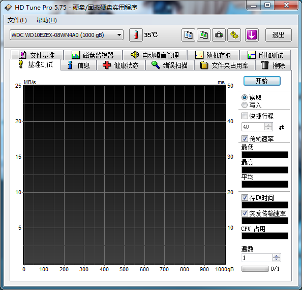 2、点击 HDTune 软件上的开始进行对硬盘测试,在测试过程中建议大家不要再运行其它相关软件,以免影响测试结果。正常情况下,在左侧中您可以看到当前硬盘的读取和写入选项,数值越大说明硬盘读写能力越好,越低就越差。