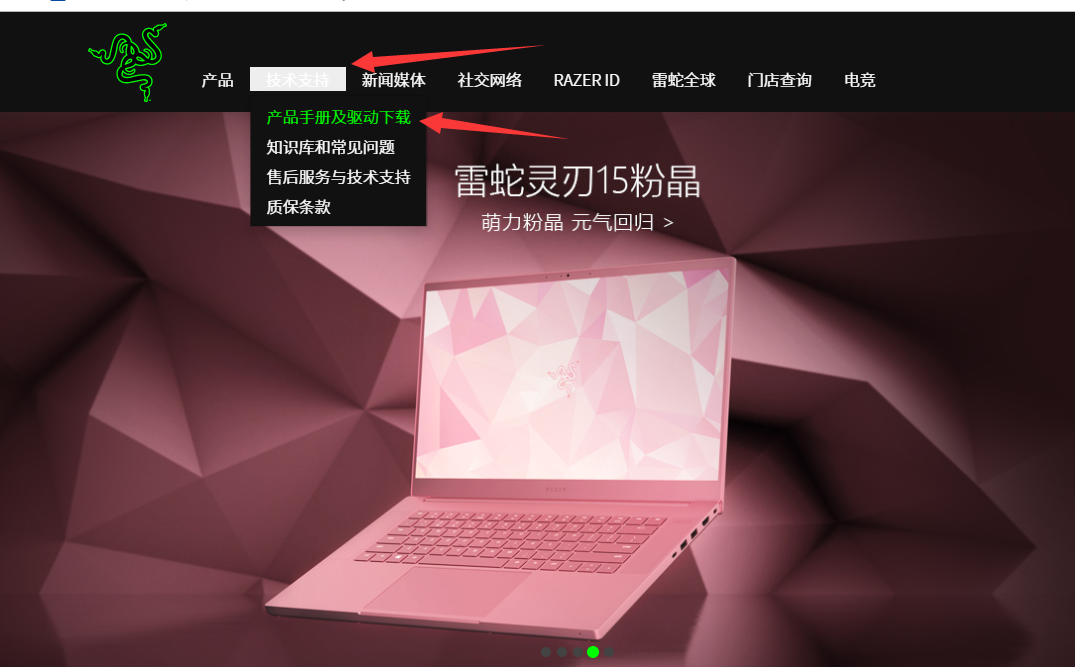 1、首先下载雷蛇驱动,进入雷蛇官网,点击技术支持下方的产品手册及驱动下载。