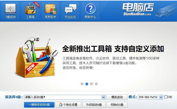 1、下载电脑店U软件,U盘插入电脑,点击一键制作启动U盘