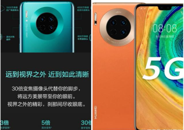 华为Mate 30搭载徕卡三摄:4000万像素RYYB广角摄像头(IMX600)+1600万像素超广角摄像头+800万像素长焦摄像头(支持OIS,3倍光学变焦,最高30倍数字变焦)。前置双摄,别为2400万像素主摄(支持固定焦距),还有一枚姿态感应镜头。