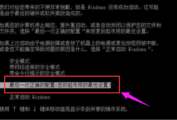 1、进入最近一次的正确配置:当我们电脑进入操作系统界面之前按下F8,我们便能进入到高级选项模式,我们选择最近一次正确的配置,然后点击确定,如果问题不大的话应该能够解决问题。