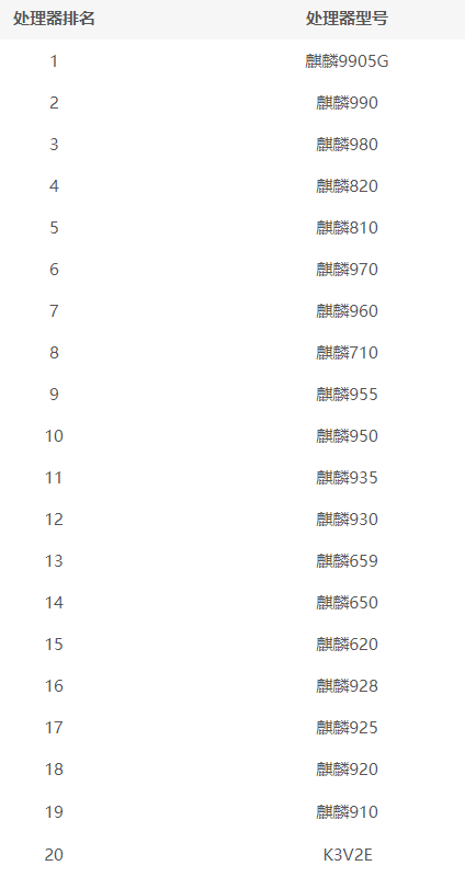麒麟处理器排行天梯图2021最新版: