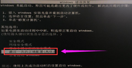 在开机启动未进入到操作系统之前我们按下F8键,选择“最后一次正确的配置”然后回车即可。此方法只能解决因出现配置问题进不了系统的情况(例如更换新硬件或加载新驱动后造成的蓝屏),由于此方法操作简单,因此再出现进不了系统的时候首先要采取此方法,如不能解决在更换其他方法。