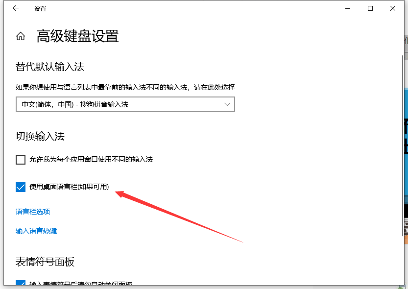 5、将高级键盘设置中的“使用桌面语言栏”勾选上。
