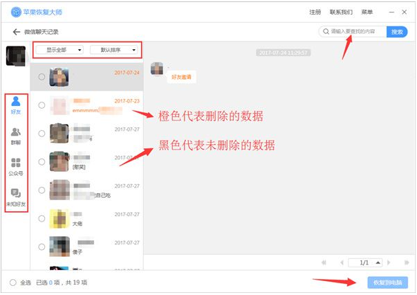 在微信聊天记录恢复界面中,在右上角的搜索框中输入关键词查找我们需要的聊天记录,找到后点击左侧的小方框进行勾选,再点击下方【恢复到电脑】,选择好恢复路径,就能够将备份中所有的微信聊天记录恢复到电脑上打开并进行查看了。