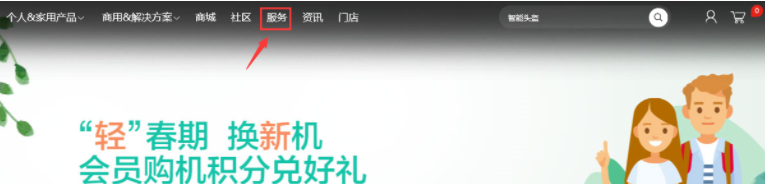 1、打开联想官网(https://www.lenovo.com.cn/),点击“服务”选项,如图: