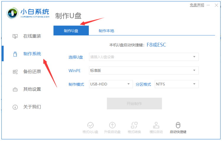 1、首先在自己的电脑上下载一个小白一键重装系统软件,下载好后打开软件,选择制作系统里的制作U盘选项。