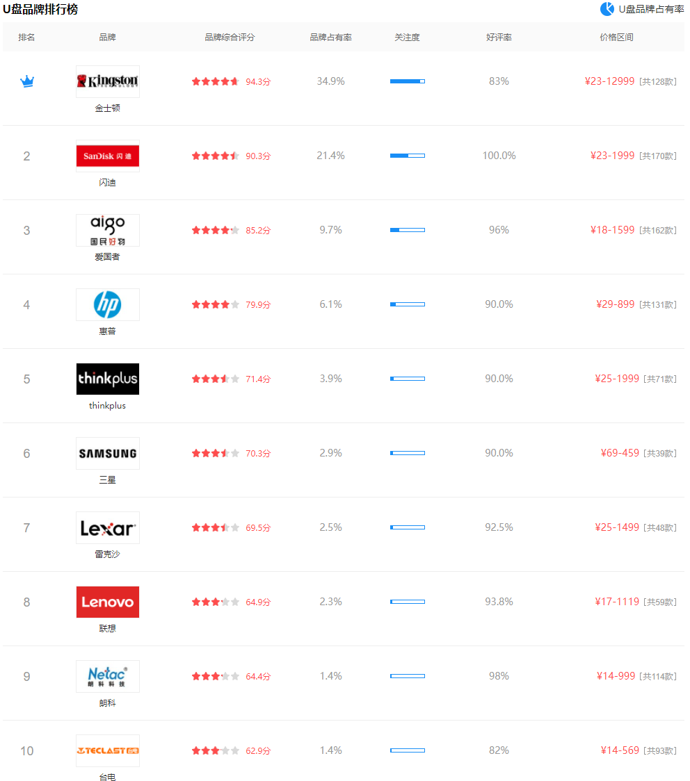 从图中可以看出,备受大家欢迎的前面三名分别是金士顿,闪迪,爱国者的u盘,也是目前市场占有率比较高,评价相对比较好的产品。不过前十的其他产品也不错,感兴趣的小伙伴可以根据自己的需要去选择合适自己的u盘产品使用哦。