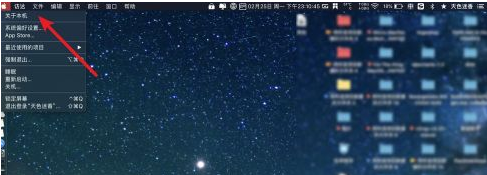 1.首先我们打开苹果电脑,进入到桌面时我们点击上方的任务栏,找到苹果的图标,弹出来的选项卡中选择”关于本机“按钮。