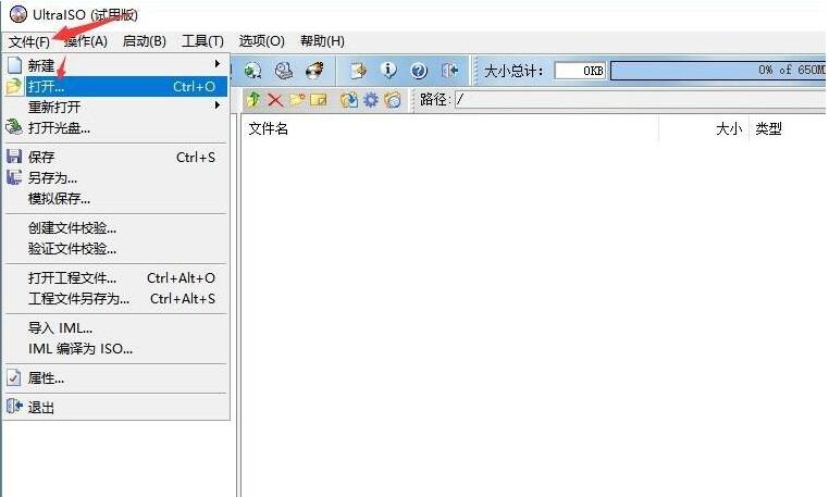 1、打开ultraISO软件,插入u盘进电脑,点击【开始】>【打开】。