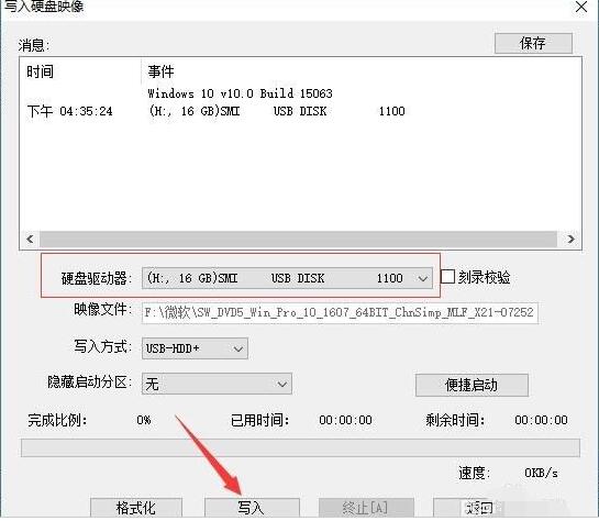 4、在“写入硬盘映像”窗口,硬盘驱动器会选择U盘(如果电脑上插了多个U盘,在这里可以选择使用哪个),点击【写入】。