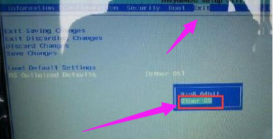 1.我们按开机键,等待开机画面出现时按f2进入bios,点击【Exit】,把【OS optimized Defaults】里默认的Win8 64bit改成【Other OS】。