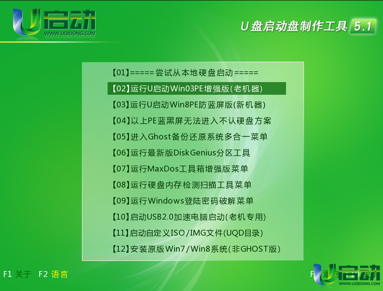 1、首先,将u盘插在电脑的usb接口上(台式机用户建议将u盘插在主机机箱后置的usb接口),使用u启动制作出来的u盘启动盘,从网上或者其它途径下载一个iso系统镜像文件(在这里我们使用 win7 iso镜像文件),并将iso系统镜像文件存放在u启动u盘的gho文件夹下。然后重启电脑,在看到开机画面后使用一键u盘启动快捷键或者使用启动项引导设置进入到u启动主菜单界面,选择【02】运行u启动win03pe增强版(老机器);如下图所示: