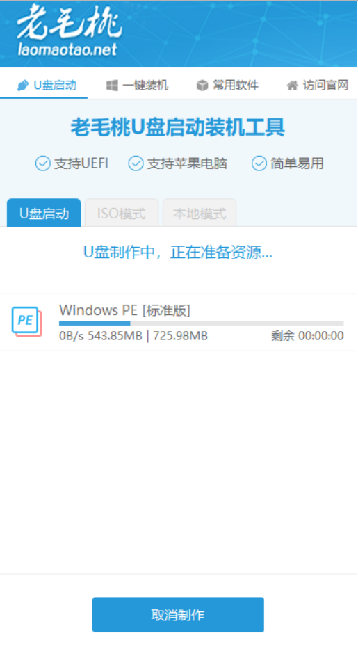 这时候老毛桃U盘启动装机工具对U盘写入老毛桃相关数据,请耐心等待