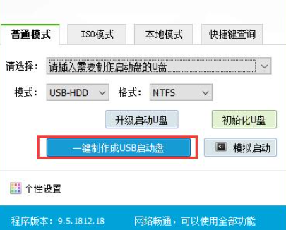 3、选择普通模式选项卡,“请选择”中选择自身U盘设备名称。模式选择USB—HDD,格式选择“NTFS”