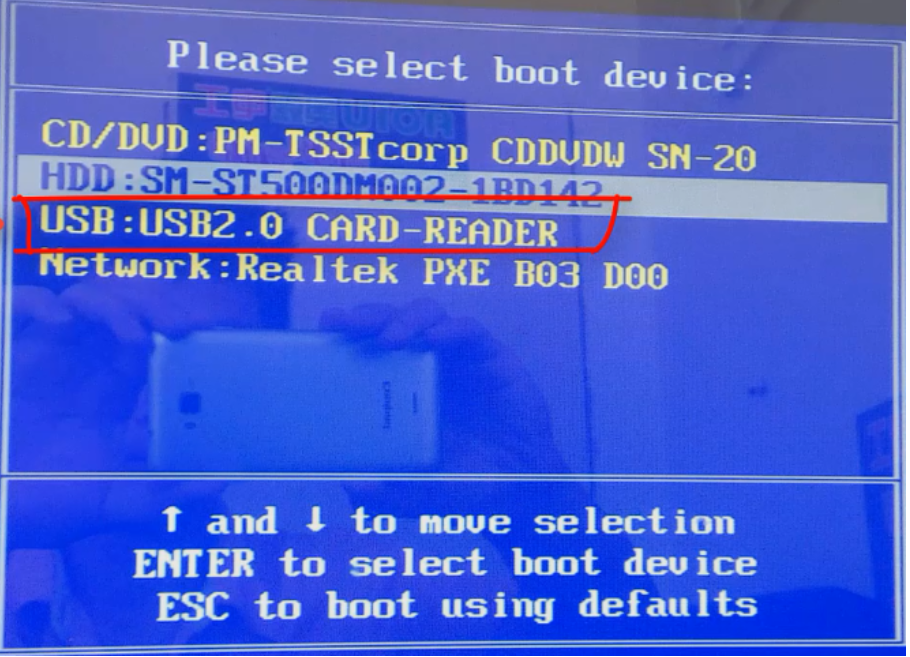 4、u盘插入需要重装的电脑,并重启电脑快速断续的按启动热键进入快速启动界面,选择带USB开头的u盘启动项回车键进入。