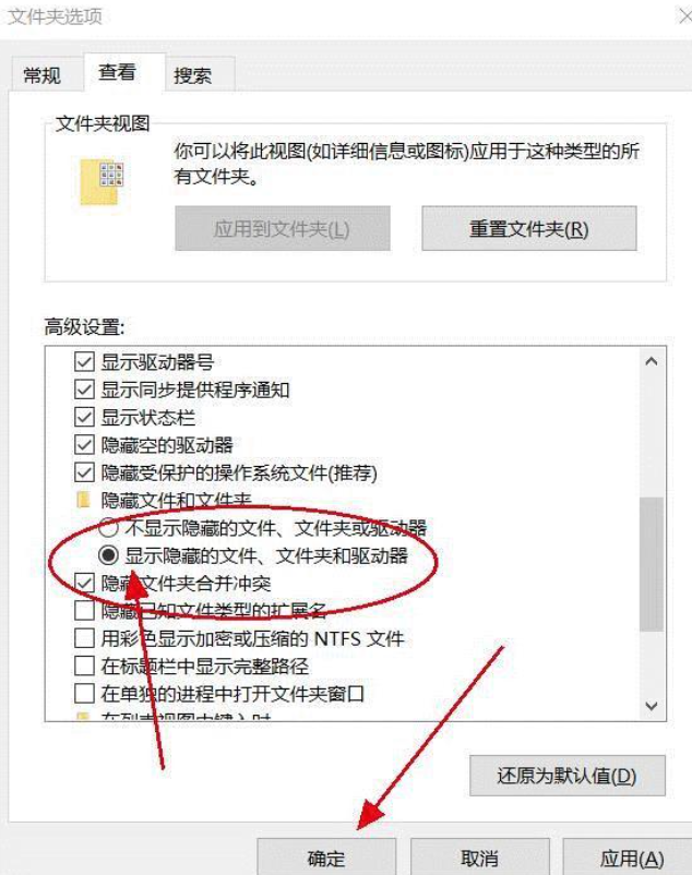 3、文件夹选项进去后,点击“查看”,找到“隐藏文件和文件夹”选中“显示隐藏的文件,文件夹和驱动器”选项,并点击“确定”。