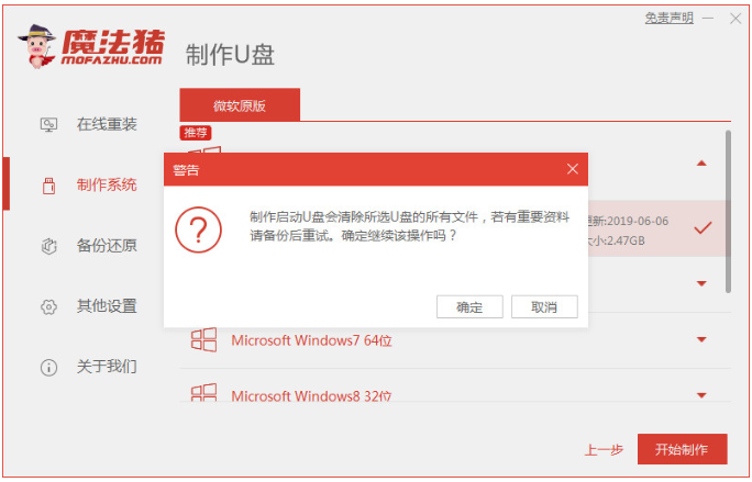 4.选择自己需要的系统安装到U盘,在制作启动U盘前要将盘内重要的资料备份好,然后选择开始制作。
