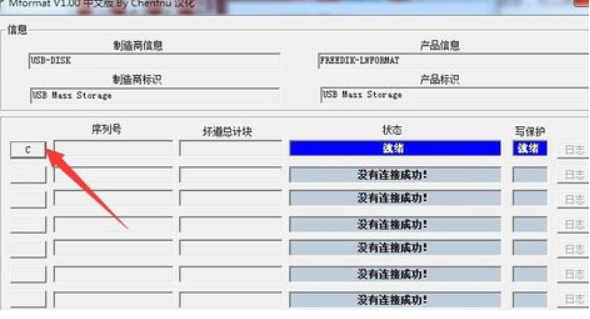 3、U盘执行量产操作:点击“U盘修复工具”按钮进入U盘量产界面。确保在U盘插入电脑USB接口的前下,程序将弹出如图所示的“U盘修复”界面中,当U盘被正常识别后,点击对应项左侧的“C”按钮即可进入自动修复过程。