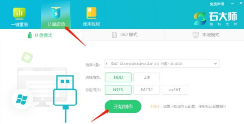 1、先官网下载石大师并打开,打开软件后,选择U盘启动,点击开始制作。