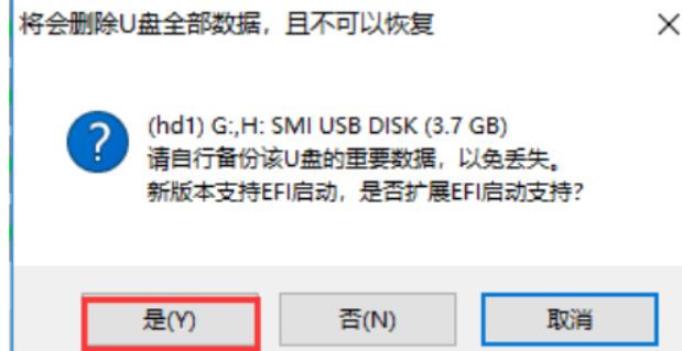 4.出现【U盘数据删除且不可恢复】的窗口,点击【是】。