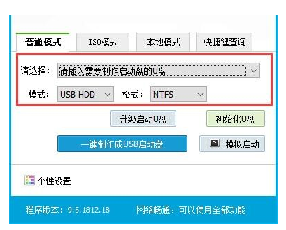 3、选择普通模式选项卡,“请选择”中选择插入的U盘设备名称(一般会自动识别)。模式选择USB—HDD,格式选择“NTFS”